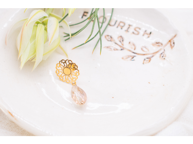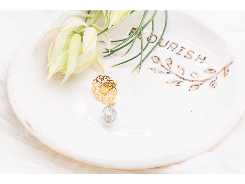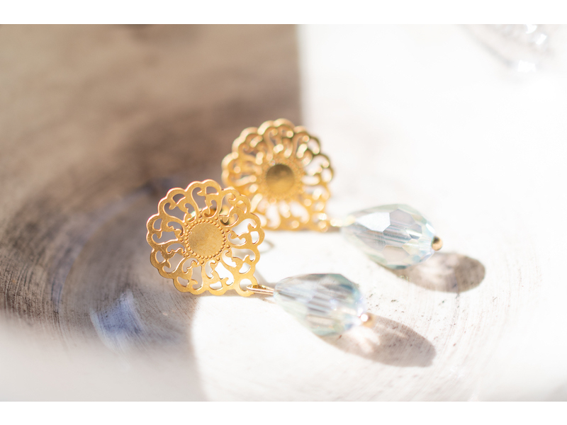 Approximately 1,5cm diameter gold plated filigree studs made from stainless steel with a tear drop shape crystal bead.
