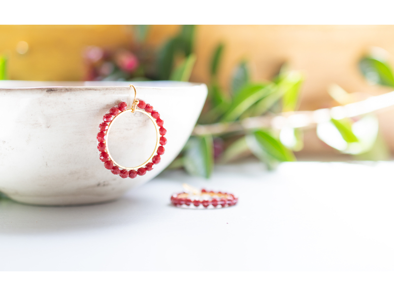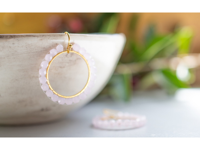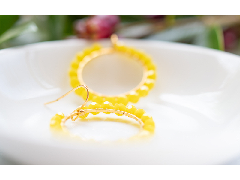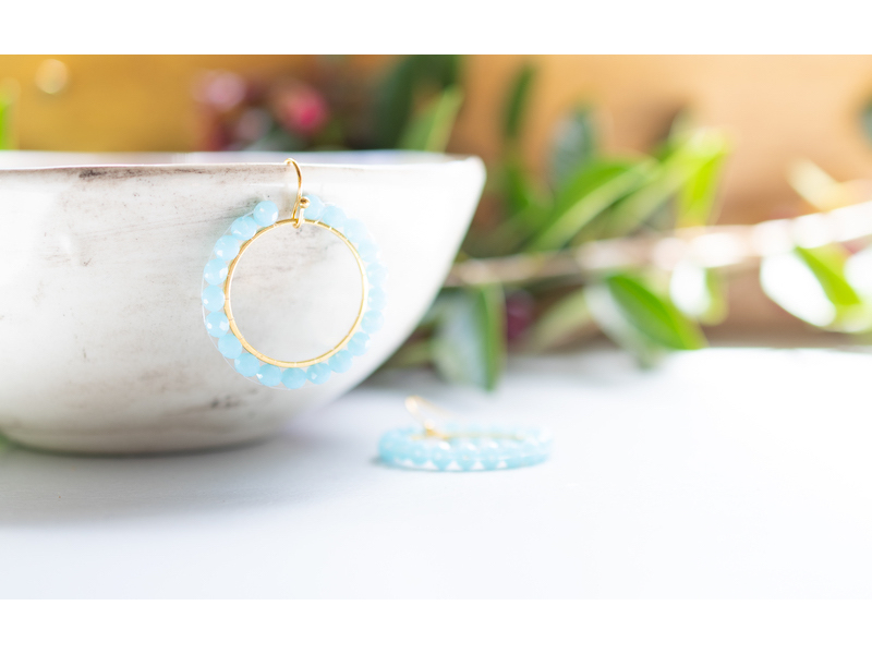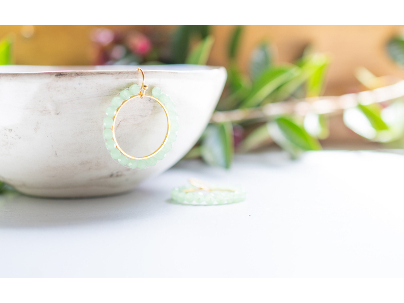 Approximately 2,5cm diameter gold plated hoops, delicately threaded with 4mm crystal beads. Please get in touch with us for more colour variations.