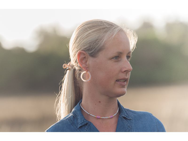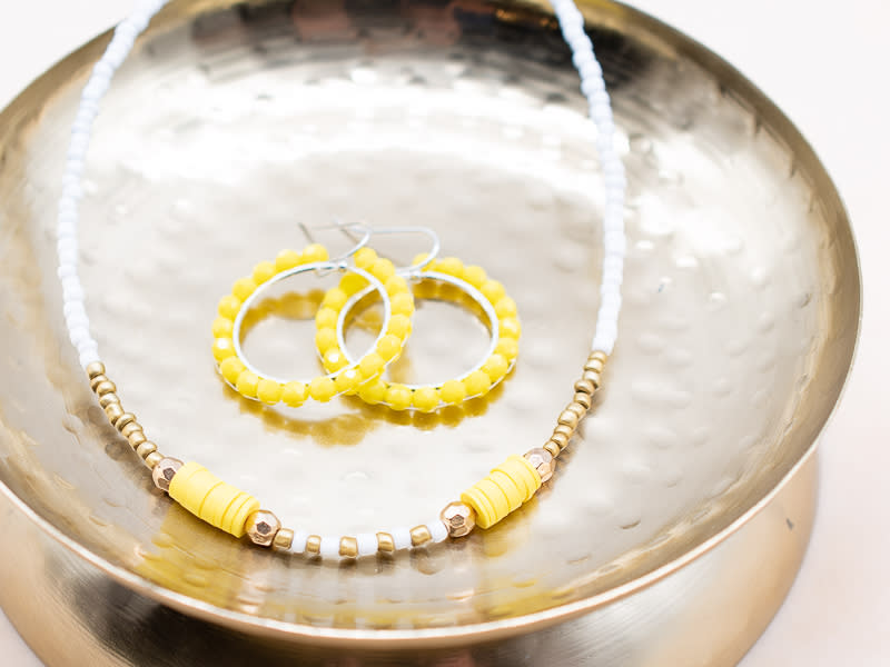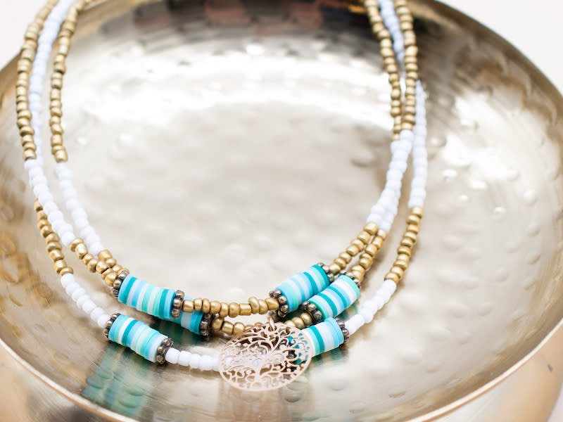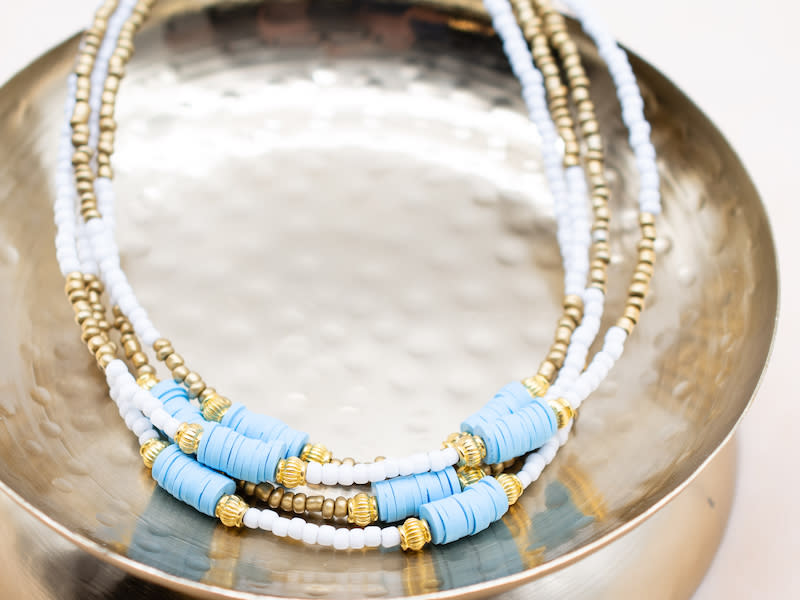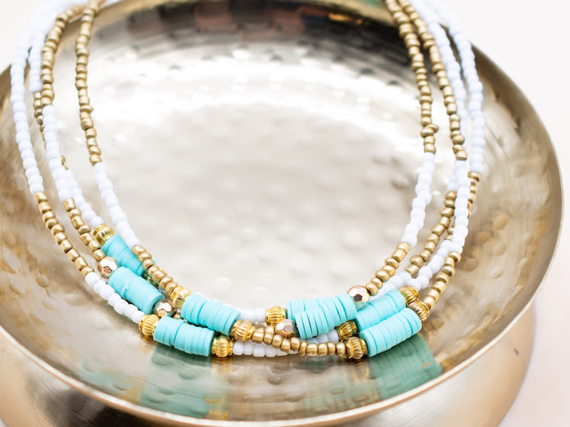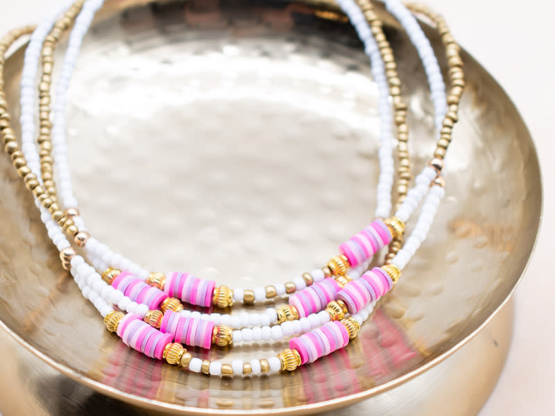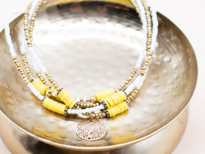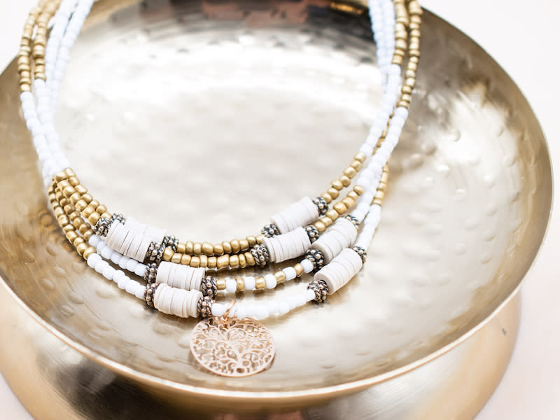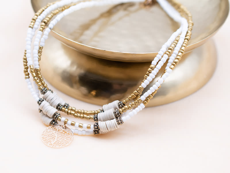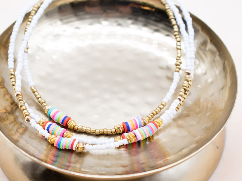 Choker necklace with polymer clay and seed beads. Gold plated lobster clasp and 3 cm chain extender. Sold individually. Please select if your prefer more white or more gold seed beads.