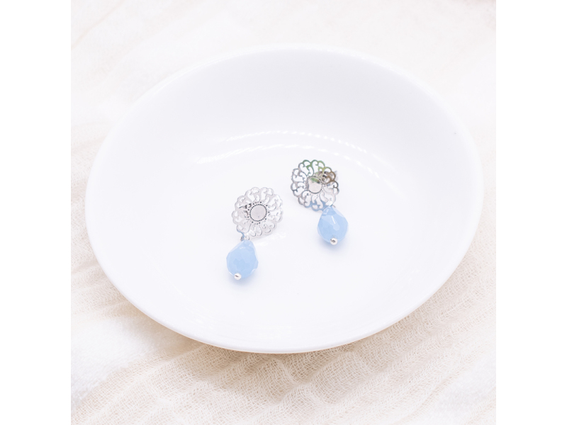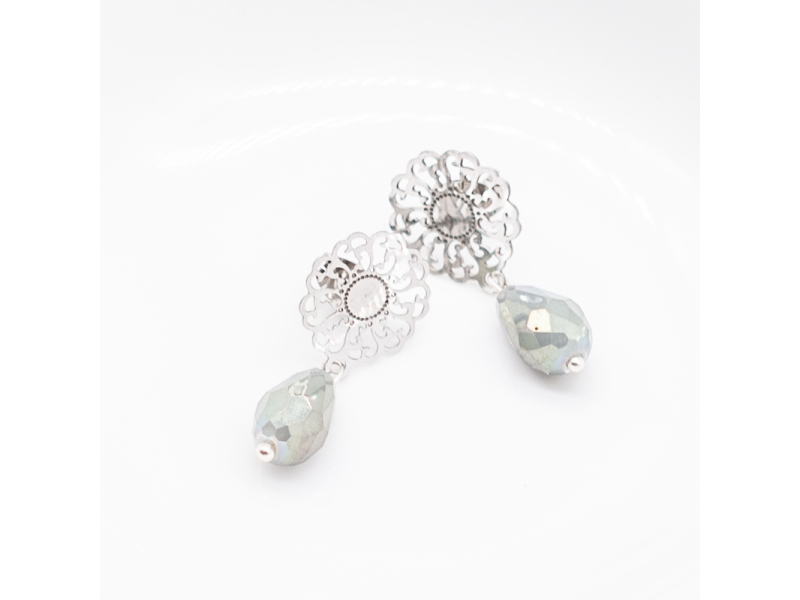 Approximately 1,5cm diameter silver plated filigree studs made from stainless steel with a tear drop shape crystal bead.